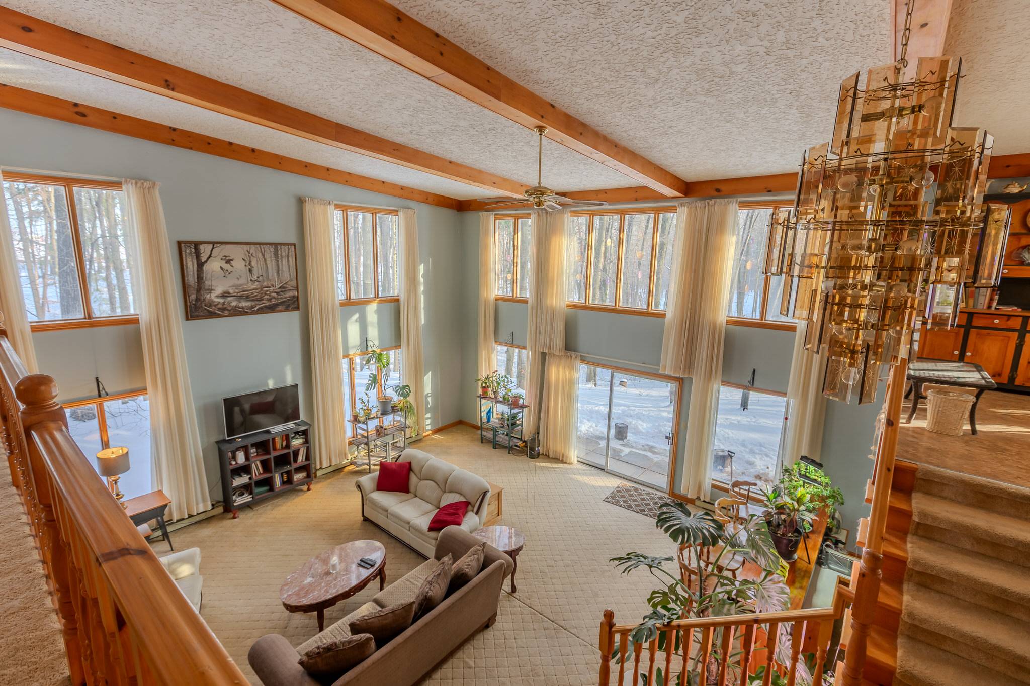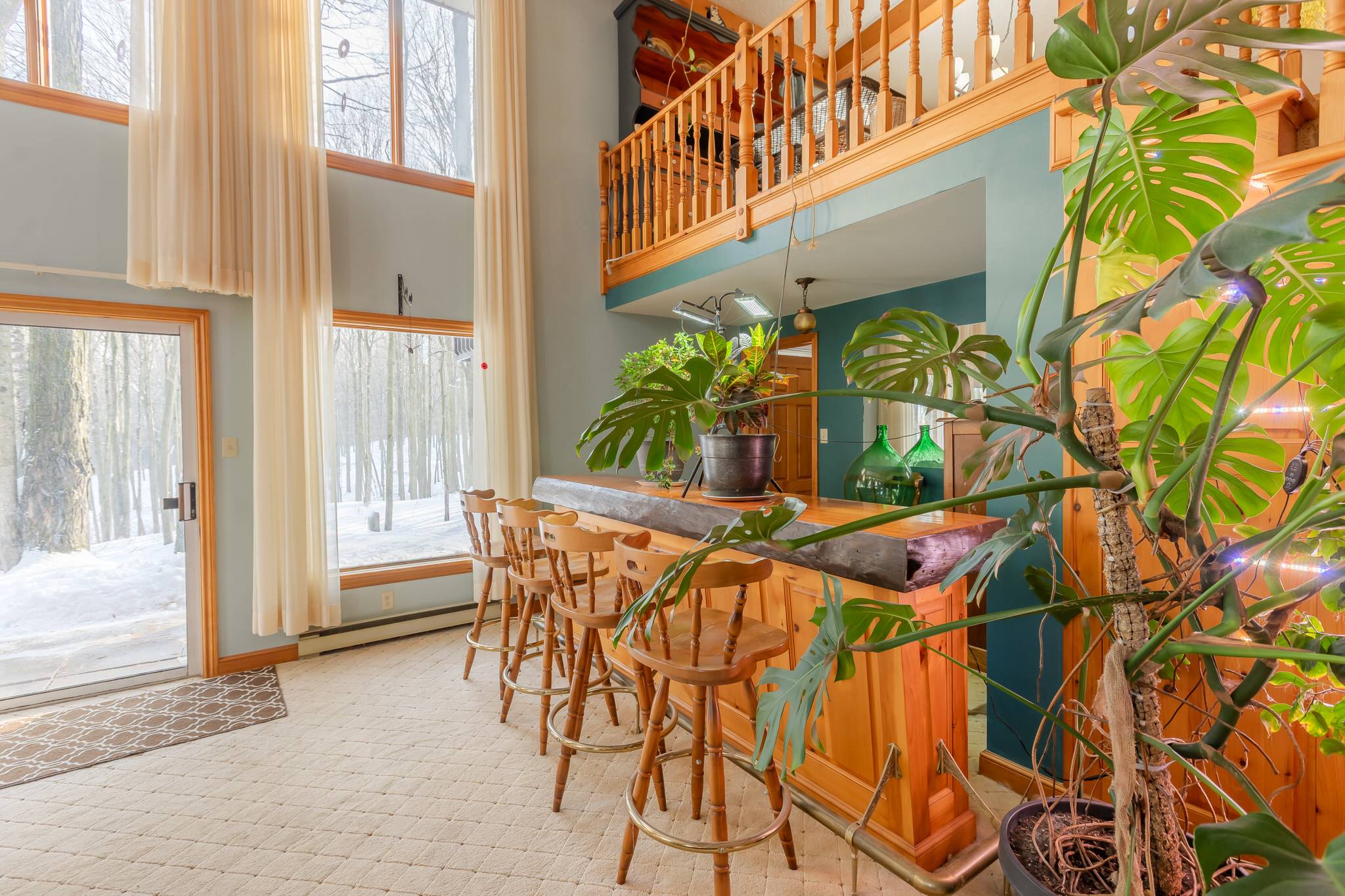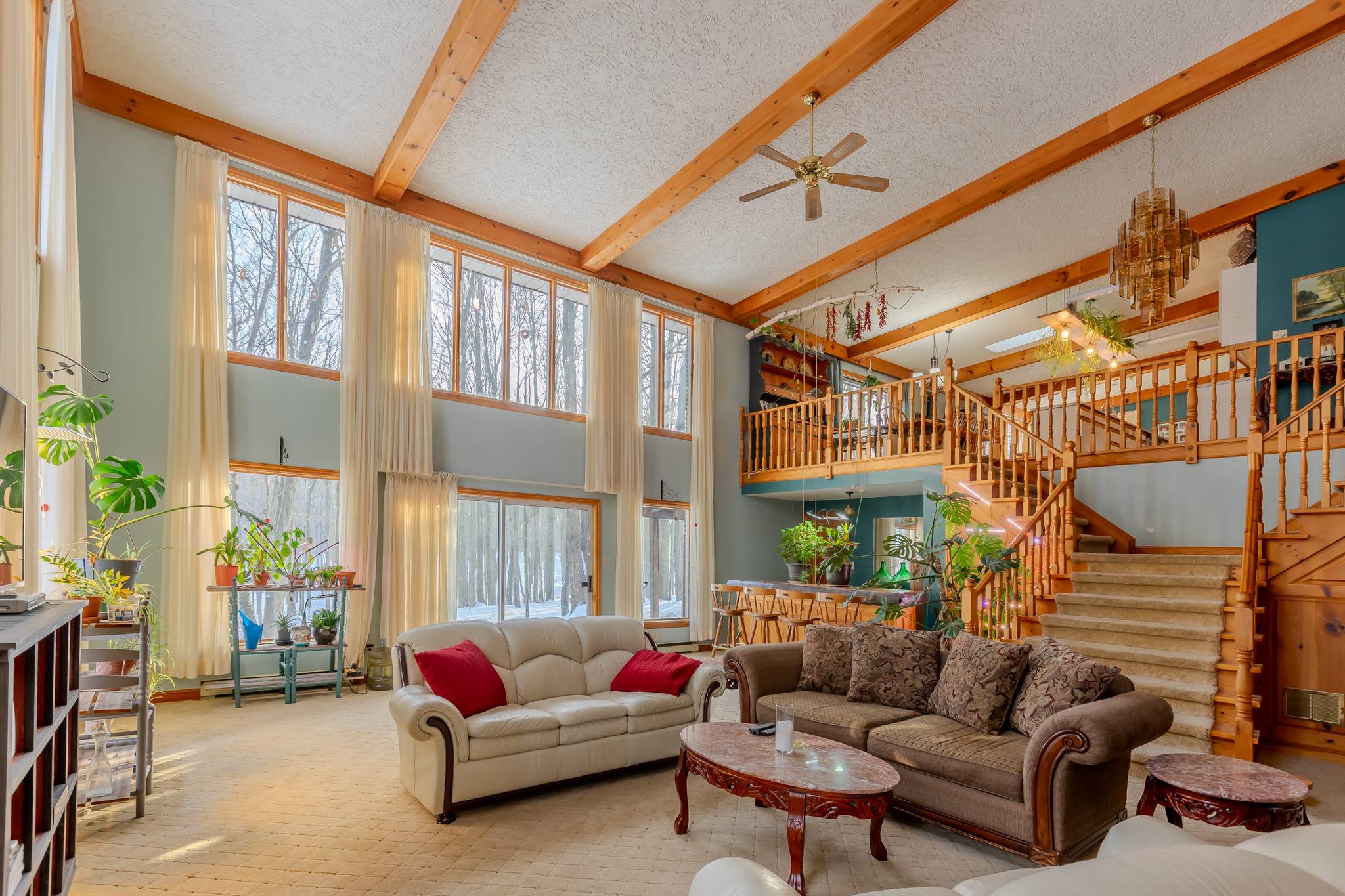 At the heart of the home is the impressive Great Room, highlighted by a dramatic ~19-foot vaulted and beamed ceiling and expansive floor-to-ceiling windows that flood the space with natural light. A wet bar and cozy wood stove enhance the inviting atmosphere, while a walkout provides seamless access to the backyard and surrounding woodland—bringing nature indoors.