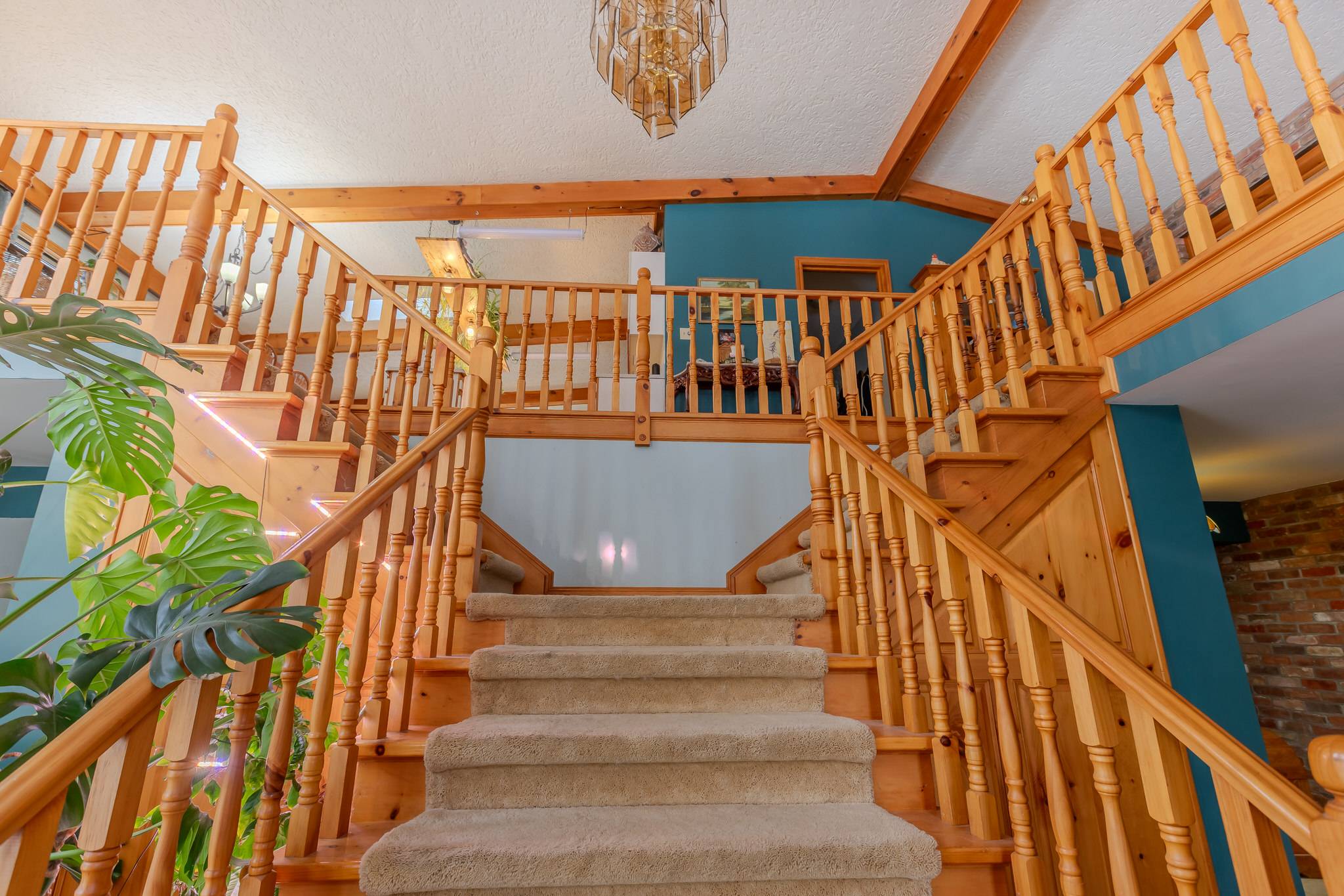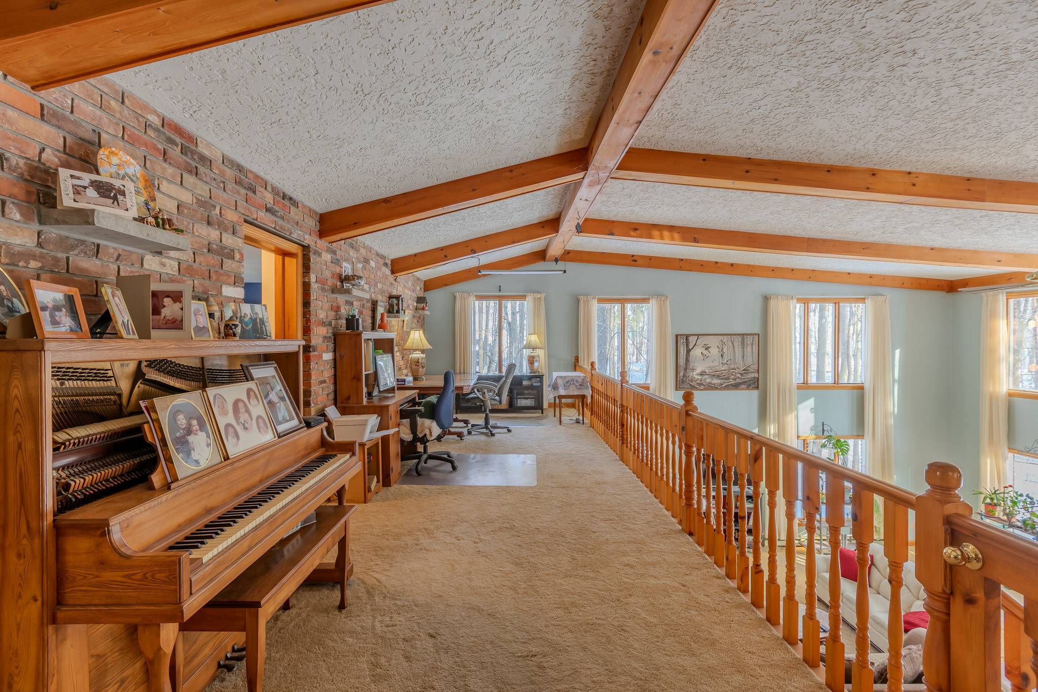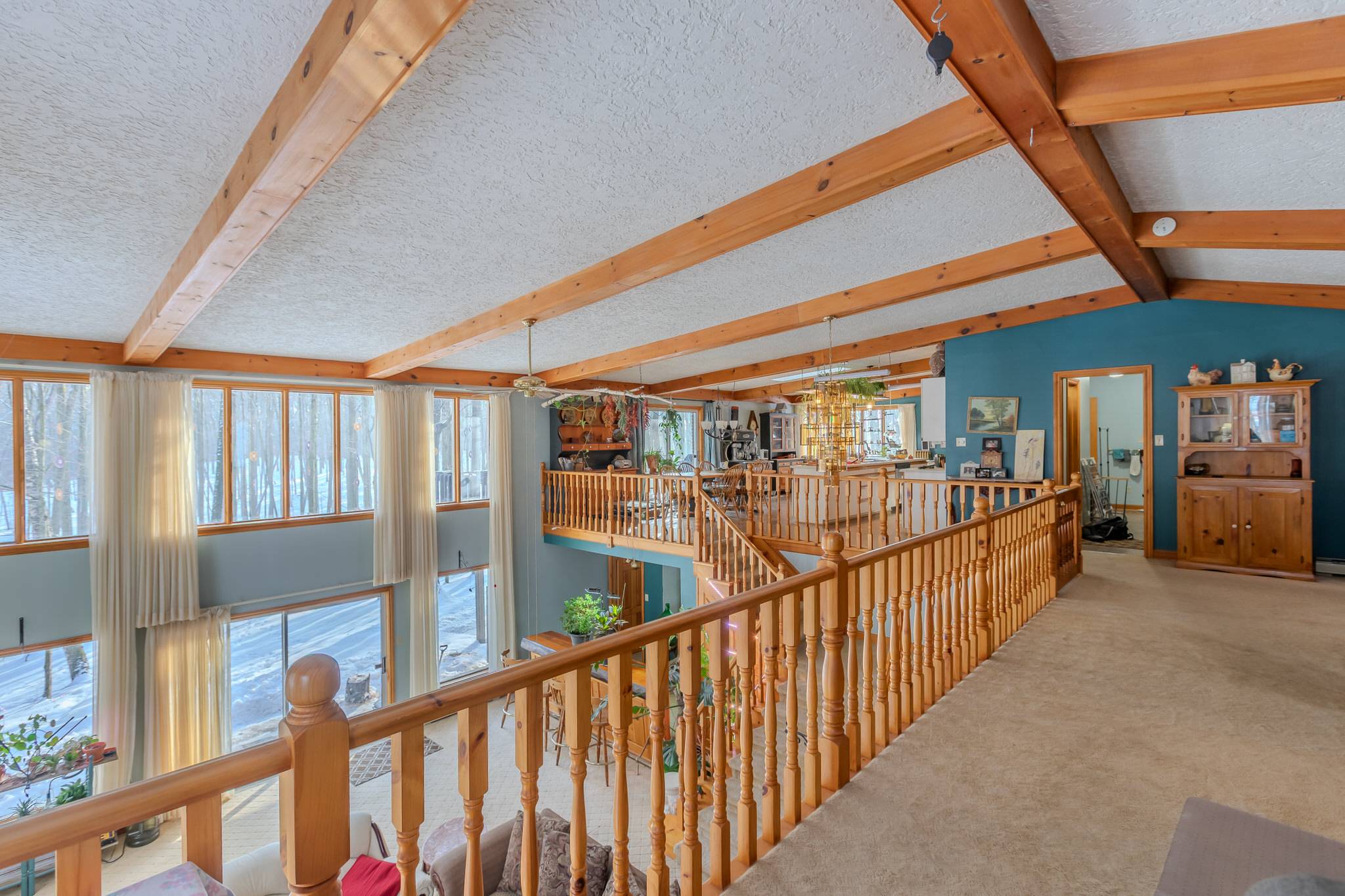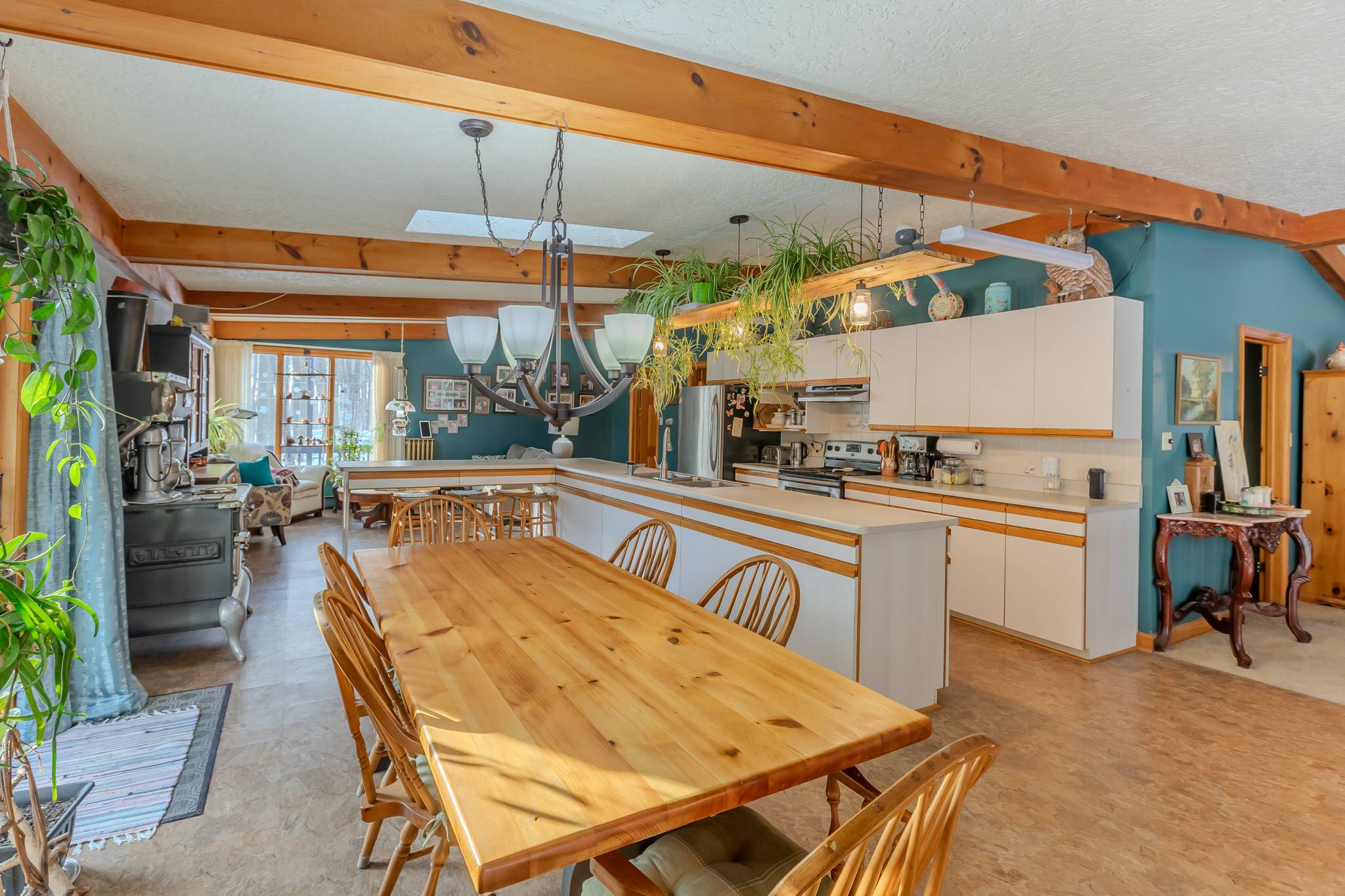 The eat-in kitchen continues the home’s open and airy design, featuring a vaulted and beamed ceiling, stainless steel appliances, and a large centre island ideal for gathering and entertaining. Skylights and windows bathe the space in sunlight, while a comfortable sitting area and walkout to the wrap-around deck offer effortless indoor-outdoor living.