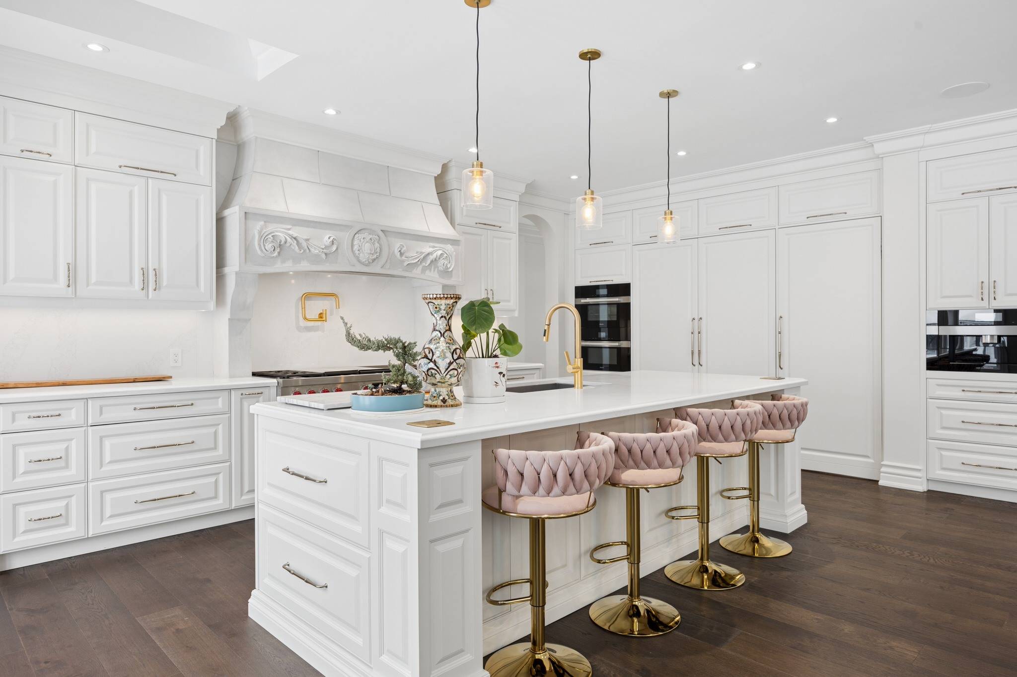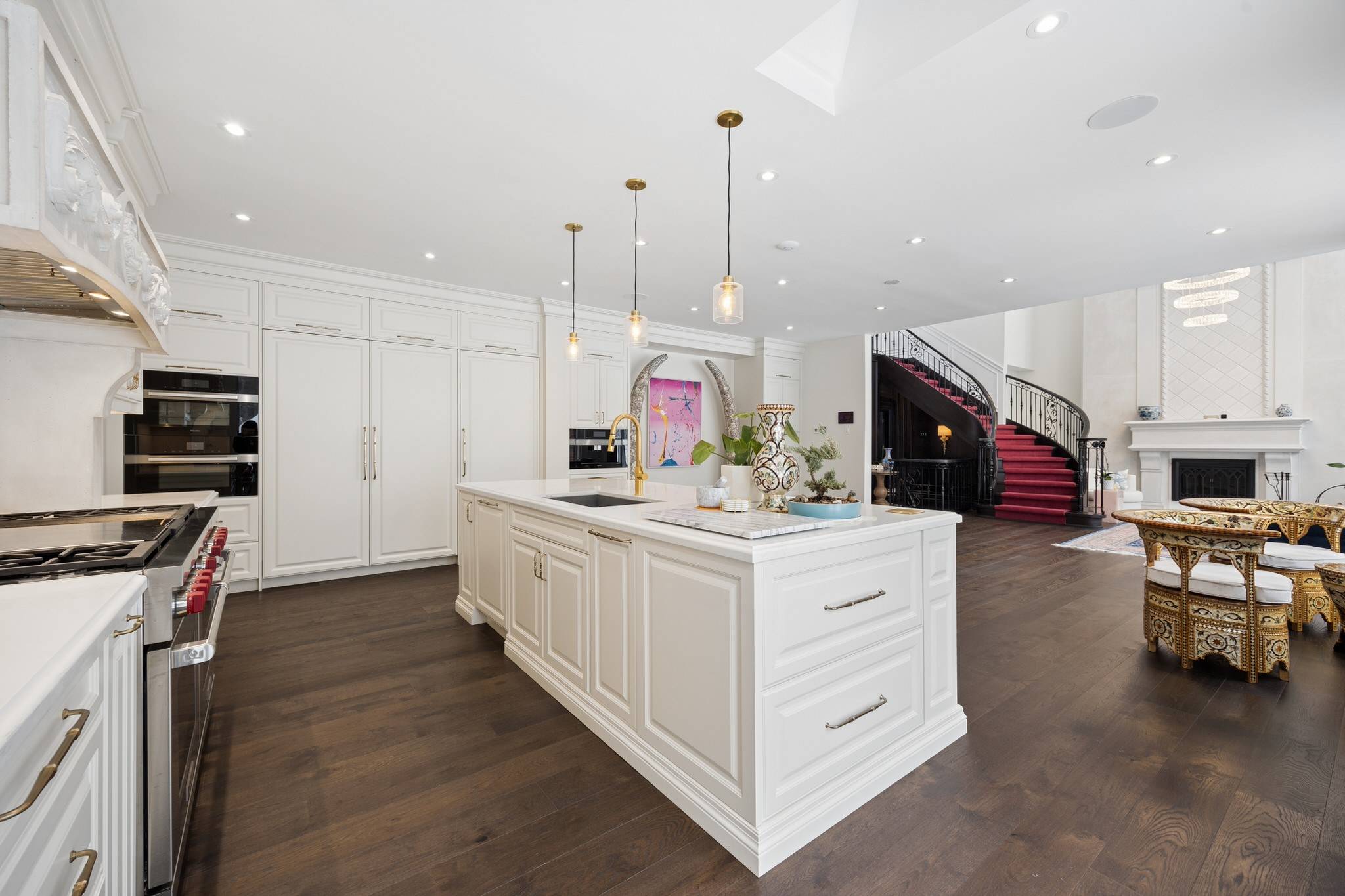 The chef’s kitchen is a showpiece of design and function. Floor-to-ceiling cabinetry with soft-close features, under-cabinet lighting, and integrated pull-outs complement a 60-inch Wolf gas range with dual ovens and griddle.
