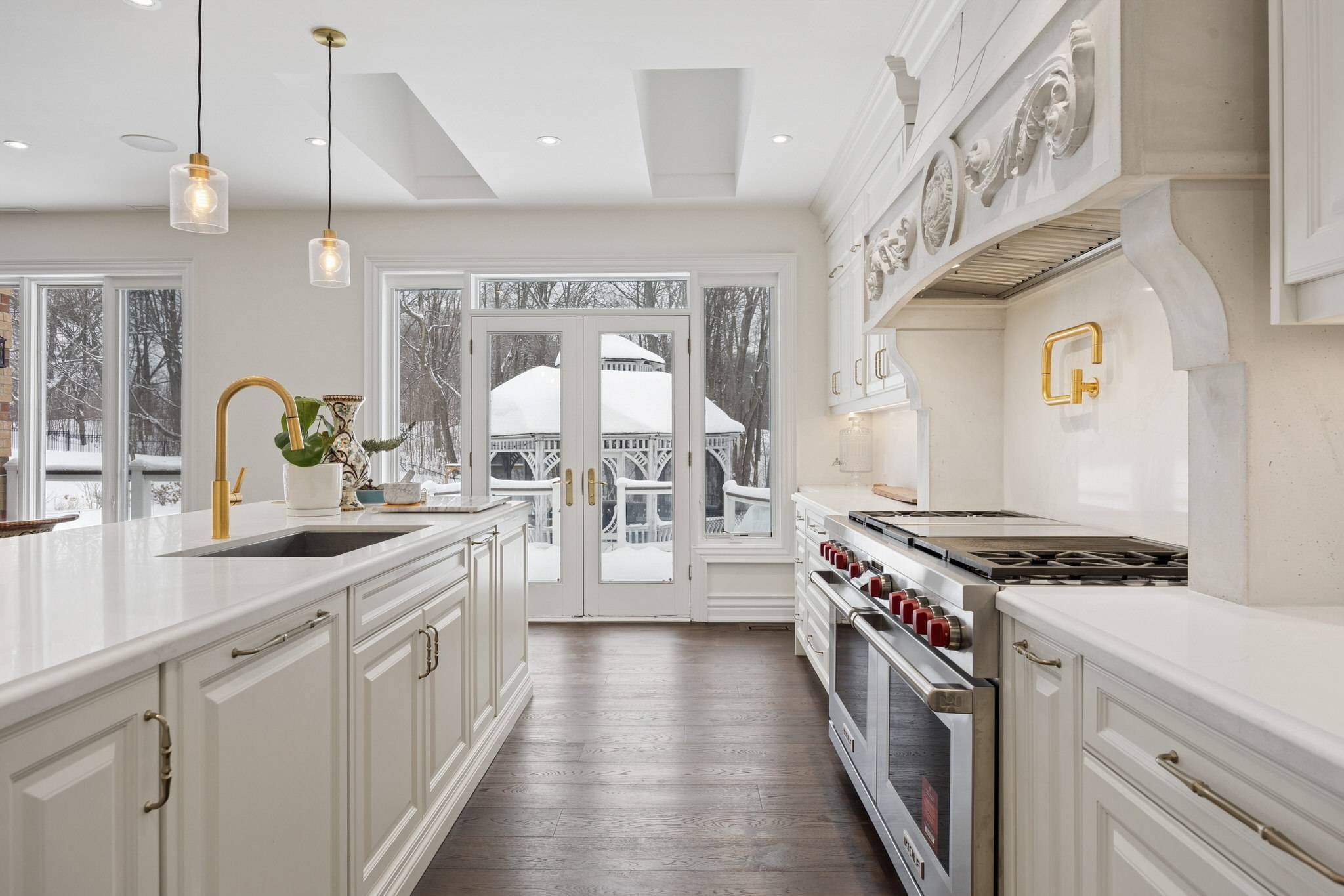 Premium appliances include cabinet-matched Dacor refrigeration, Miele dishwasher, built-in Miele microwave combination, and Miele espresso maker. An oversized island with seating for four, skylights, Disengo fixtures, and walkout access to the deck and gazebo complete this exceptional space.
