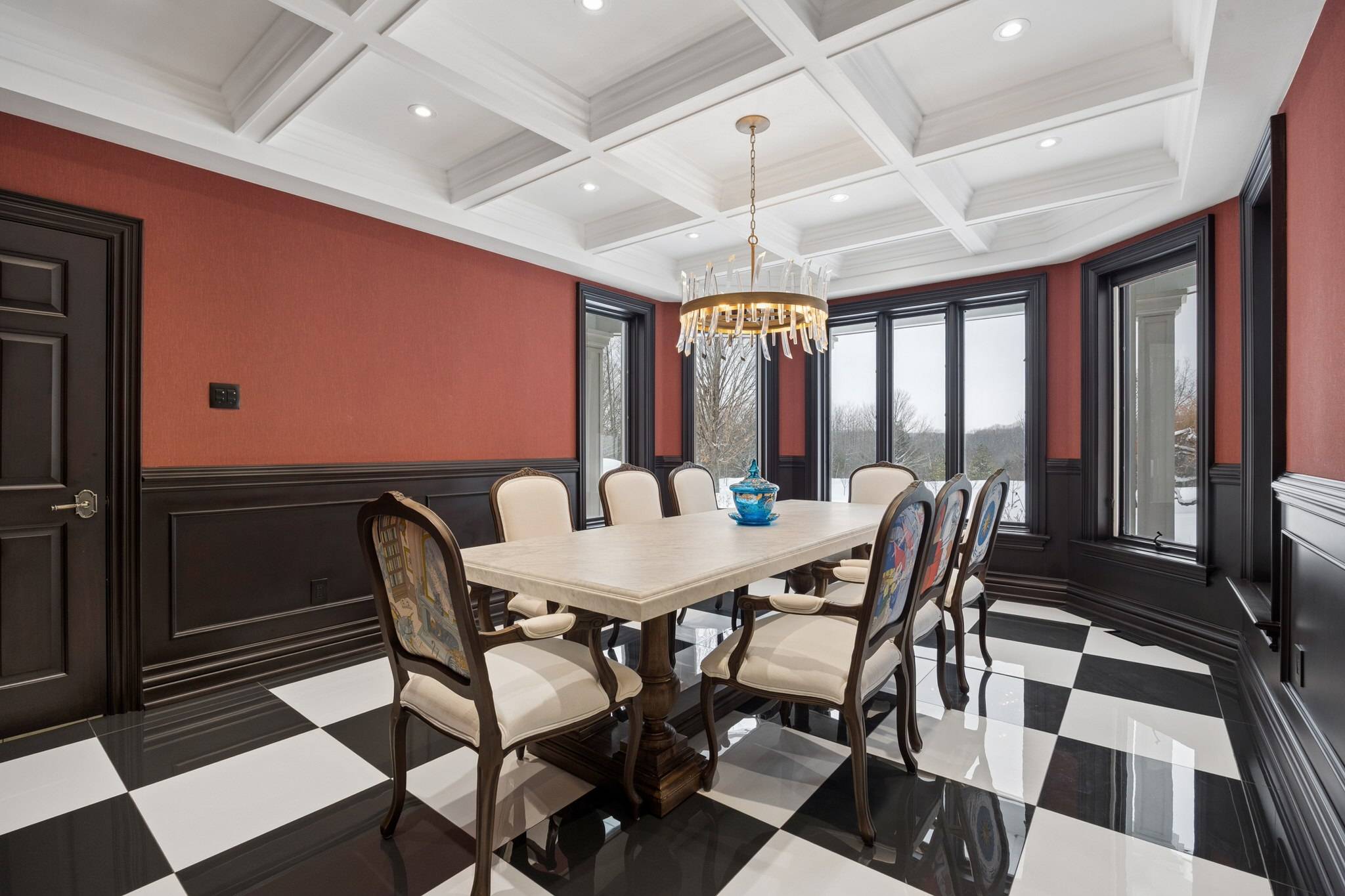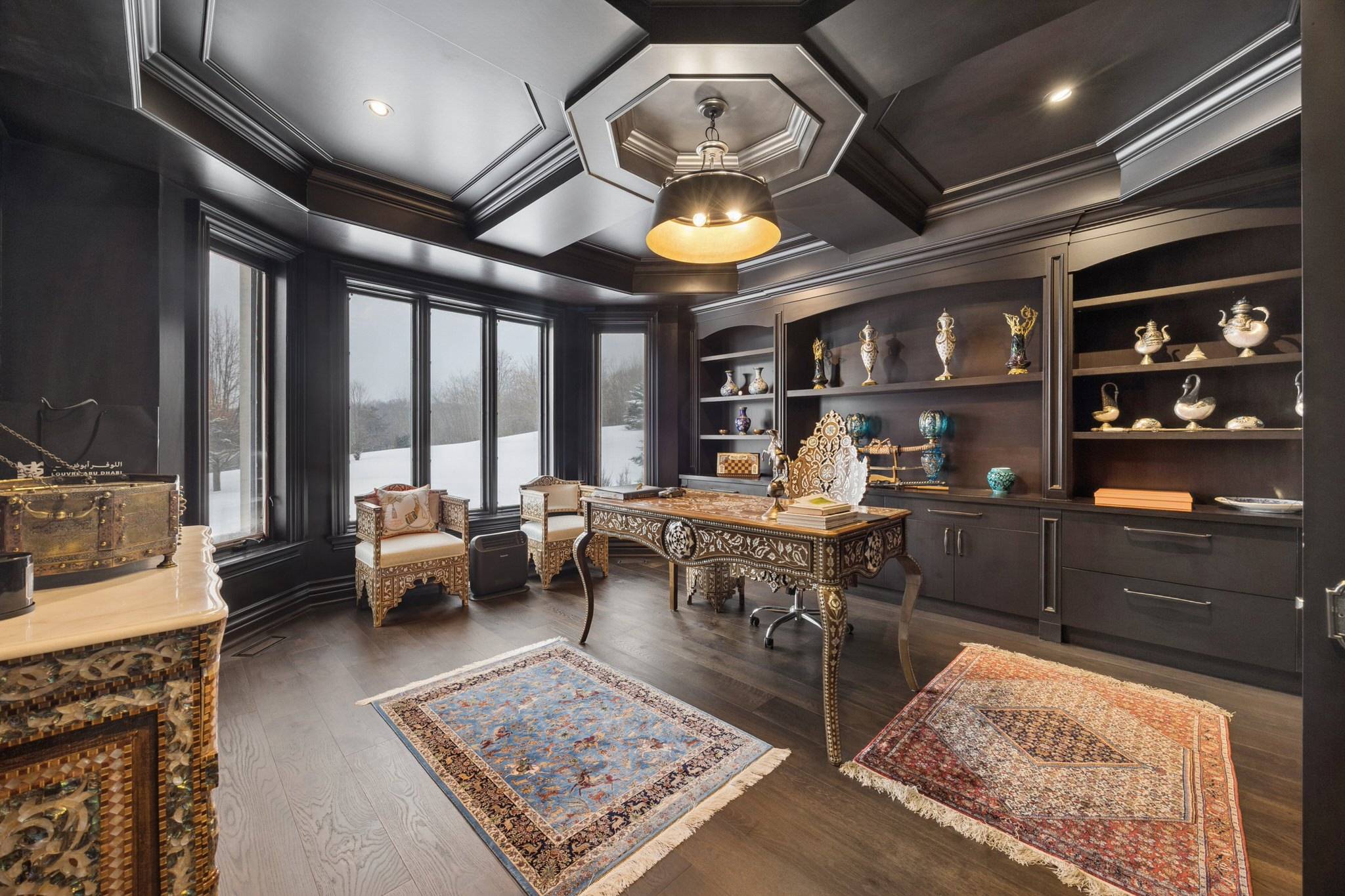 The front office is richly appointed with book-matched wood panelled walls, a wood coffered ceiling, and custom built-ins — ideal for professionals seeking a refined work-from-home environment within Uxbridge’s most prestigious estate setting.