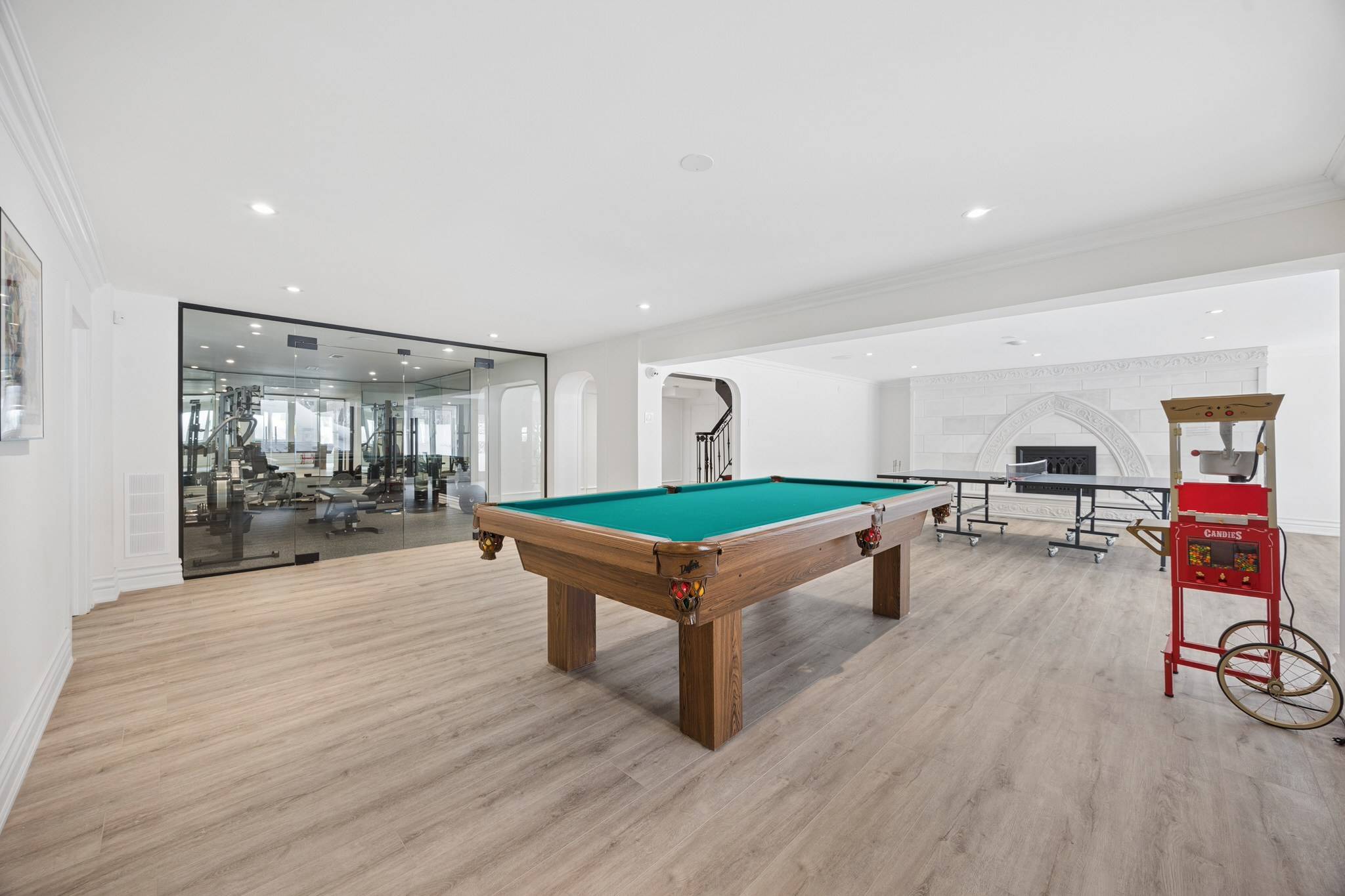 Additional highlights include a custom cast stone fireplace in the recreation room, games room, glass-enclosed gym, and a soundproof theatre room for premium cinematic experiences.