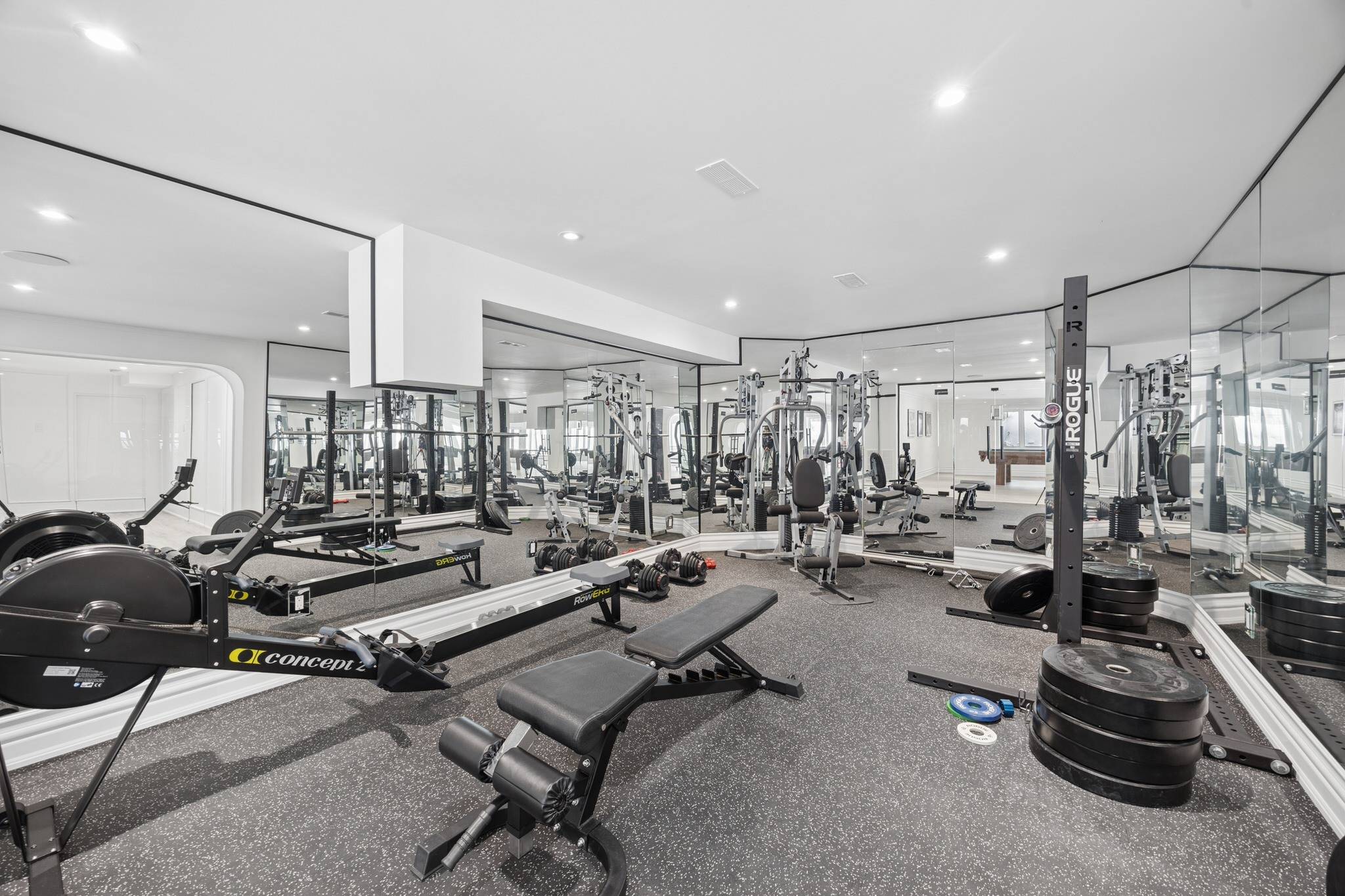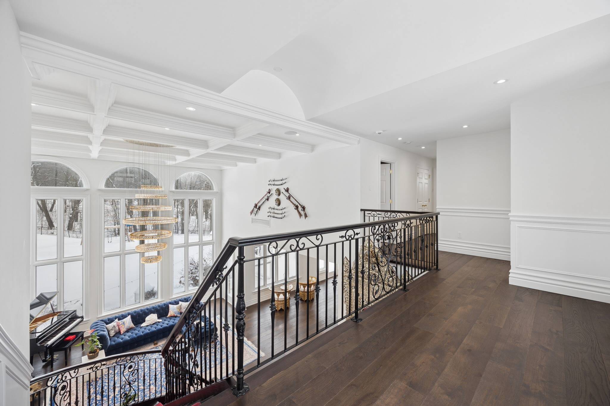 Modern automation, integrated monitoring and audiovisual systems, new HVAC with advanced controls, spray foam insulation, and app-connected garage doors ensure efficiency and convenience. Custom millwork, coffered ceilings, wainscoting, and crown mouldings reflect meticulous craftsmanship throughout.