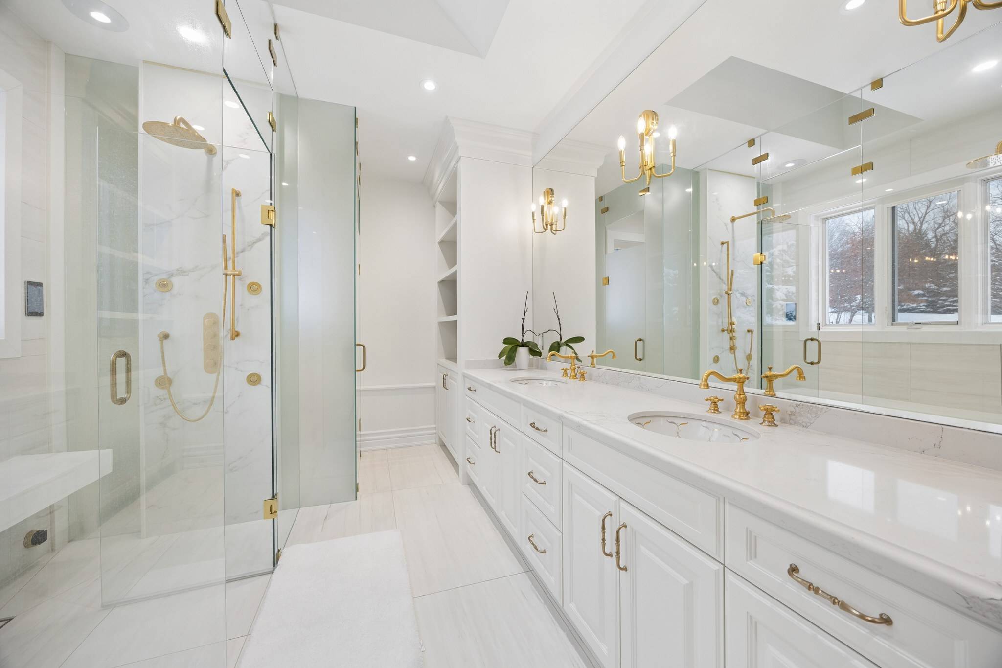 The six-piece spa-inspired ensuite features a Toto smart toilet, dual-head steam shower, gold fixtures, Kohler sinks, and private water closet. A custom dressing room with built-ins completes this luxurious retreat.